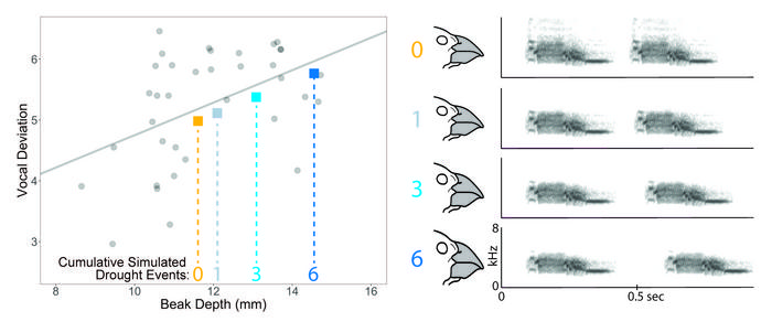 “We found that there were no changes in the finches’ responses to our modified calls even when the simulated songs had changed by the equivalent of three drought events,” says Katie M. Schroeder, the paper’s co-author who participated in this research during her doctoral training under Podos at UMass Amherst. “But by six drought events, the had changed so much that the finches barely responded at all.”