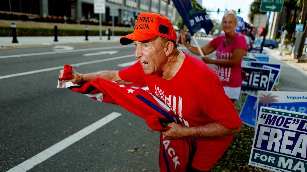 A supporter of Republican presidential nominee Donald Trump rallies outside an early polling precinct as voters cast their ballots in local, state, and national elections, in Clearwater, Florida, U.S., November 3, 2024.