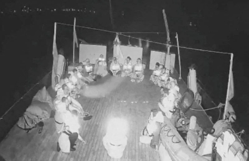 Video grab taken from a livestream broadcasted on 1 October 2025 by the Global Sumud Flotilla shows Meteque, one the boats intercepted by the Israeli Forces. The crew, hands raised, adopt this position to show that they are unarmed and pose no threat. © Handout / Global Sumud Flotilla / AFP