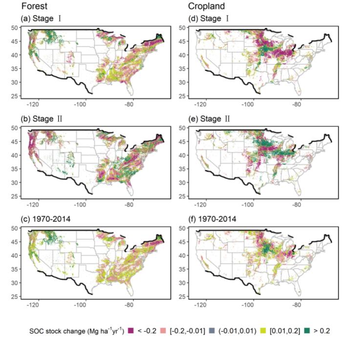 This study integrated SOC measurements, time-series statistical analysis, and machine learning techniques, revealing a two-phase trajectory of SOC change in forest and cropland ecosystems across the contiguous United States. From the 1970s to the 1990s, SOC showed a non-linear loss trend. Since the 1990s, however, SOC loss has stagnated. Furthermore, starting from the late 1990s, while SOC changes in the cropland 0–30 cm layer remained stagnant, both the cropland 30–100 cm layer and the entire soil profile in forest systems began to show an increasing trend.
