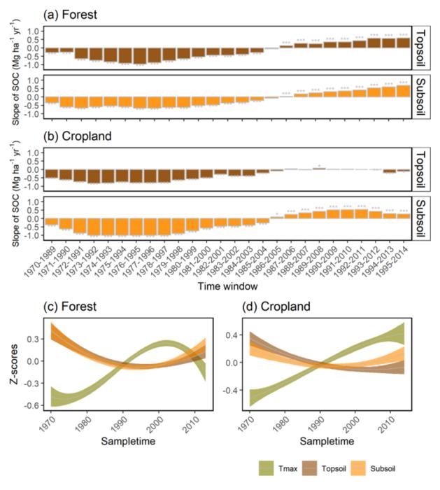 Outlook: The study highlights a strong connection between the rate of warming and changes in SOC stocks from 1970 to 2014. Given the recorded temperature increases since 2015, the recently accelerated warming may reverse the current trend of increasing SOC stocks in forest and cropland soils. Therefore, extending monitoring beyond 2014 is crucial to validate the observed change patterns. Concurrently, mechanistic research on how warming rates drive SOC changes across different ecosystems and soil depths should be pursued, with particular attention to deep soil moisture dynamics. These insights are essential for improving the parameterization of SOC responses to temperature and precipitation changes in Earth system models.