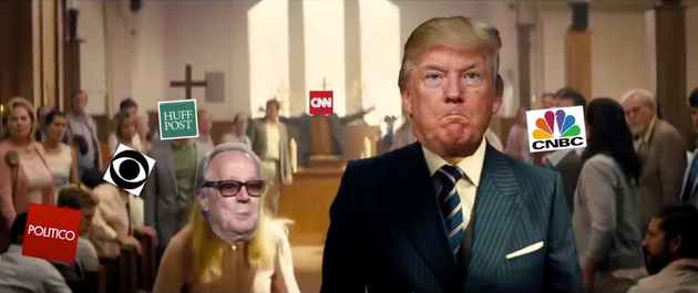 In the video — which features a modified clip from the 2014 film “Kingsman: The Secret Service” — a man with Trump’s superimposed face goes on a violent and bloody rampage inside what’s called the “Church of Fake News.”
