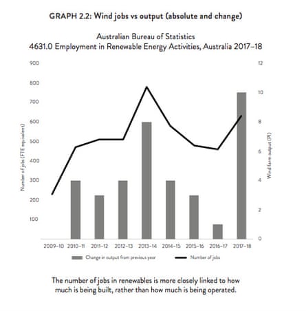 Renewable energy jobs rely mostly on new growth, rather than existing projects. But the “jobs” narrative around renewable energy has, problematically, failed to provide clarity about this temporal skew. This is borne out in the Australian Bureau of Statistics’ figures on wind power employment, which show that the number of jobs in the wind industry has remained steady, even though the number of wind turbines in Australia has increased significantly (see graph below).