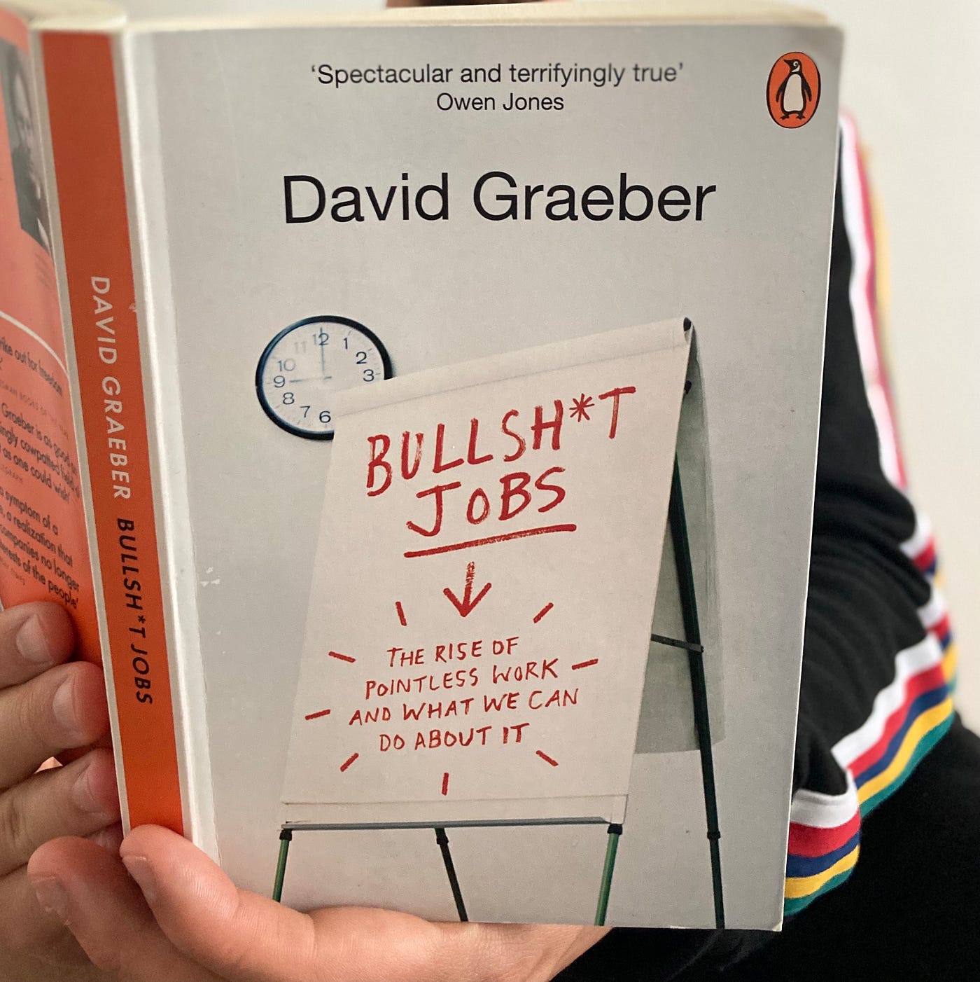 Irecently read David Graeber’s classic book, Bullshit Jobs, and as suspected, it was entertaining while being mind-blowingly enlightening. His anthropological knowledge, crowdsourced first-hand accounts, and writing chops made this the fastest book I’ve read in a long time.