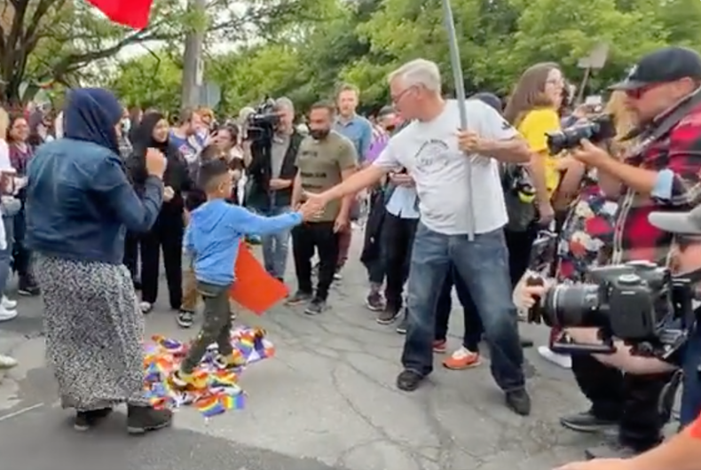 Video from the demonstration shows Muslim women and others encouraging young children to stomp and dance on progress Pride flags strewn on the ground and clapping with joy.