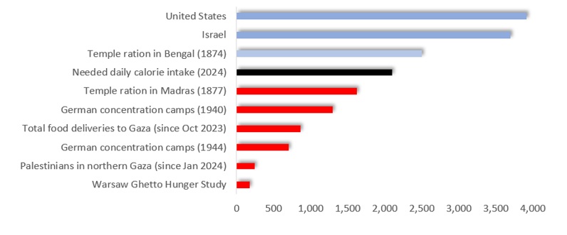 What about Gaza? Measured in terms of total food deliveries into the Strip since October 2023, the calorie intake was about 860 kcal, a third less than in the Nazi camps over eight decades ago. As the German invasion of the Soviet Union failed and the tide of World War II shifted, the Nazi camps deteriorated, with the daily intake shrinking to 700 kcal in 1944. That’s almost three times the intake of 245 kcal in northern Gaza in the first half of the year 2024, when the New York Post famously headlined that there was no famine in the Strip.