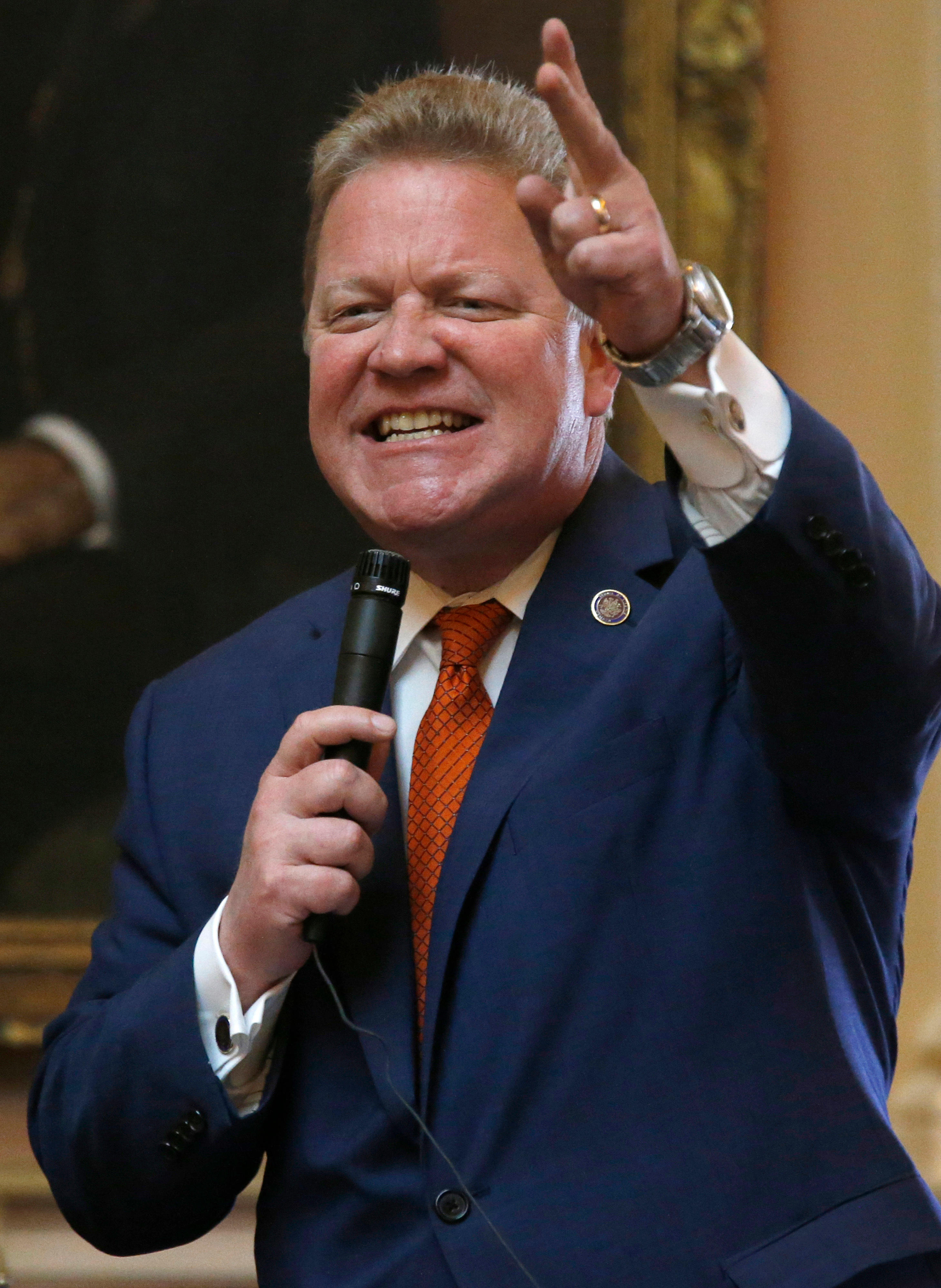 Sen. Bill Stanley, R-Franklin, speaks in opposition to SB35, a bill relating to control of firearms by localities as it was debated in the Virginia Senate inside the State Capitol in Richmond, Va., Thursday, Jan. 16, 2020. (Bob Brown/Richmond Times-Dispatch via AP)