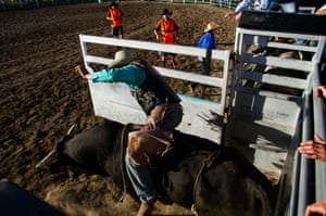 FacebookTwitterPinterest A bull being ridden out of a pen at Wanaka. Photograph: Paul Roy/The Guardian