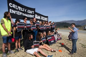 Around three dozen protesters chanted outside the Wanaka rodeo in the South Island on Thursday – “there’s no excuse for animal abuse” – calling for an end to the sport, which they say is cruel and demeaning to the animals.