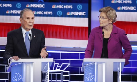 Bernie Sanders greets Mike Bloomberg and Elizabeth Warren at the Democratic debate in Las Vegas on Wednesday. Photograph: Mike Blake/Reuters
