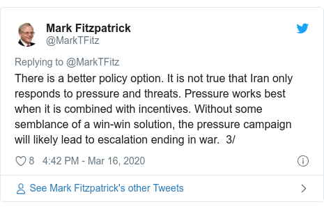 The US treasury department, she noted, had taken some small steps to clarify that the humanitarian channel to Iran remained open. But there had been no indications that the Trump administration's "maximum pressure" policy was being reconsidered, she added.