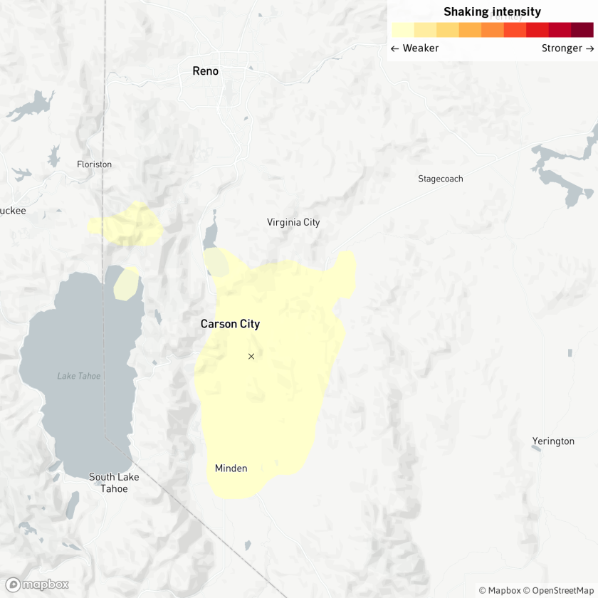 The location and shaking intensity of a magnitude 3.2 earthquake Saturday evening in Carson City, Nev.