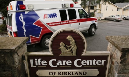 An ambulance transports a person from the Life Care Center of Kirkland, a long-term care facility linked to several confirmed coronavirus cases, in Kirkland, Washington, on Tuesday. Photograph: David Ryder/Reuters