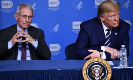 Anthony Fauci, center, the National Institute of Allergy and Infectious Diseases director, looks on next to Donald Trump during a tour of the National Institutes of Health’s Vaccine Research Center in Bethesda, Maryland, on Tuesday. Photograph: Brendan Smialowski/AFP via Getty ImagesCarome also drew a line between Trump’s communication style – which is often brash, unreliable and incoherent – to the traditionally measured, fact-based style of health experts.