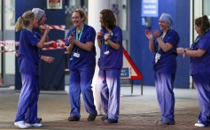Medical staff during a break in the grounds of St Thomas’ Hospital