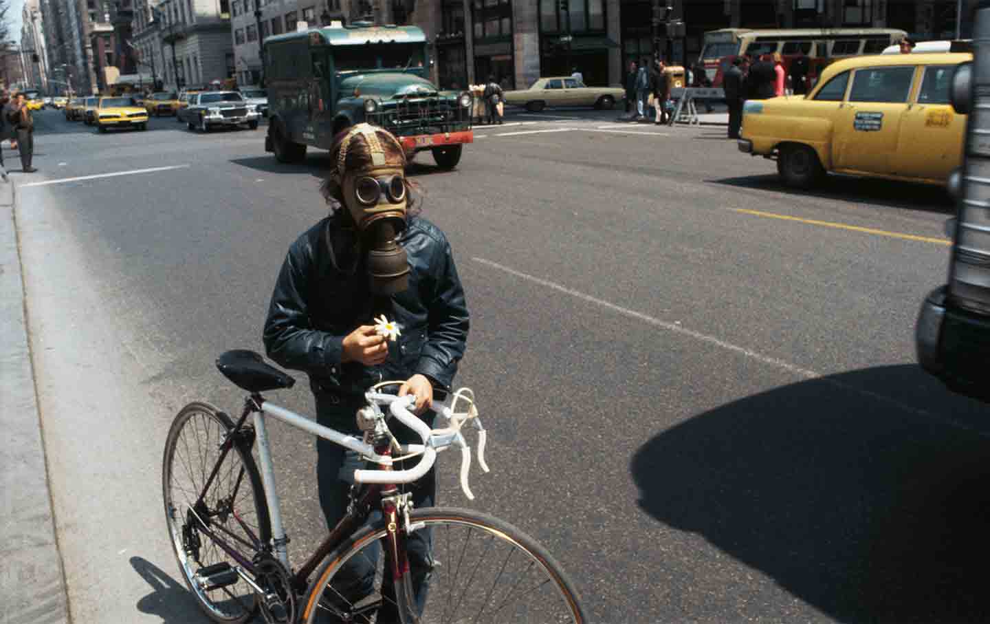Cyclist near 59th Street in Manhattan on the first Earth Day, April 22, 1970. (Bettmann / Getty Images)