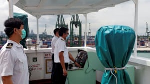 Crew wear face masks on a Pacific International Lines ship in Singapore. Photograph: Pacific International Lines/Reuters