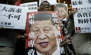 Pro-democracy activists hold up placards of Chinese President Xi Jinping with slogans including ‘End one party state’ at a ferry terminal in Hong Kong. Photograph: Kin Cheung/AP