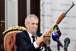 Czech President Milos Zeman holds a mock assault rifle with “At journalists” inscribed on it in October 2017. Photograph: CTK/Alamy Stock Photo