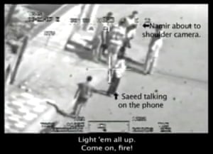 Yates says: “When the chopper circled around, Namir can be seen going to a corner and crouching down holding something – his long-lens camera – and is taking photographs of Humvees. One of the crew says, ‘He’s got an RPG’ … He’s clearly agitated. And then another 15, 20 seconds the crew gets a clear line of sight … I’m watching Namir crouching down with his camera which the pilot thinks is an RPG and they’re about to open fire. I then see a man I believe to be Saeed walking away, talking on the phone. Then cannon fire hits them. I’ve got my head in my hands … The generals stop the tape.”