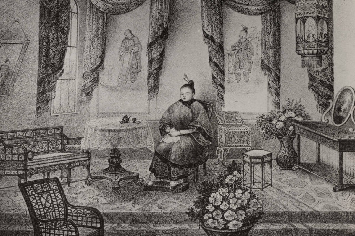 An engraving of Afong Moy. Referred to as “the first Chinese woman to arrive in America”, Moy served as a cultural bridge between China and the United States, including in private and among elites, but was eventually relegated to little more than a sensationalised caricature resulting from racial and ethnic tensions.