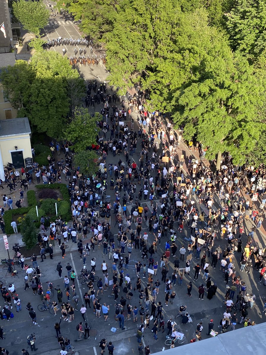 MASSIVE USE OF POLICE NATIONAL GUARD AND MILITARY TO ESCORT HIM AFTER CLEARING OUT PEACEFUL PROTESTERS. THEY WERE SURROUNDED AND ASSAULTED BY ARMOURED FORCES, MILITARY AND POLICE, FOLLOWED BY MOUNTED FORCES, CAVALRY, TWENTY MINUTES BEFORE CURFEW!