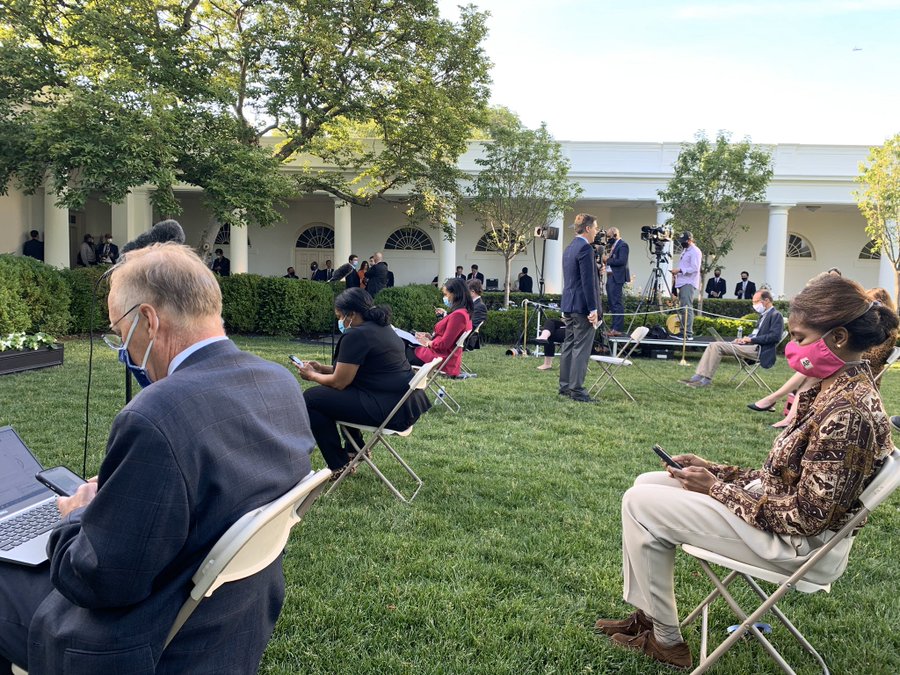 MULTIPLE LOUD BOOMS from the north (sounded like Lafayette Square Park) just shook the windows here at the White House as we sit in Rose Garden awaiting president. #dcprotest
