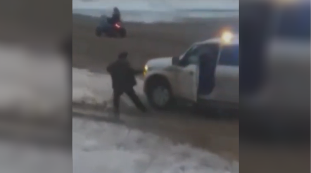 APTN NEWS/YOUTUBEA screenshot from a video posted on YouTube shows a Nunavut RCMP vehicle slowly approaching a man before he is struck by a door.