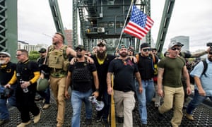 Members of the Proud Boys and other rightwing demonstrators march in Portland in 2019. Photograph: Noah Berger/AP