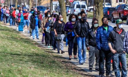 People queue to vote in the Wisconsin presidential primary in April. Photograph: Tannen Maury/EPA