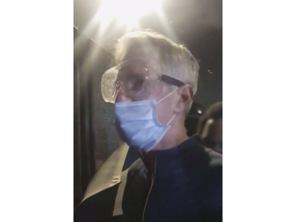 In this image made from video released by Karina Brown, Portland Mayor Ted Wheeler wears googles in thick tear gas as he stands near the federal courthouse early July 23, 2020, in Portland Oregon, during another night of protest against the presence of federal agents sent by President Donald Trump to quell unrest in the city. (Karina Brown via AP)
