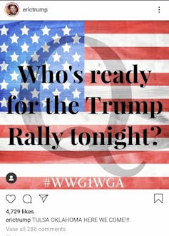 Trump associates such as his personal lawyer Rudy Giuliani, campaign manager Brad Pascale, former national security adviser Michael Flynn and Donald Trump Jr. have all amplified QAnon content as well. Most recently, Eric Trump promoted QAnon on Instagram when plugging the president’s controversial rally that was held Tulsa, Okla.