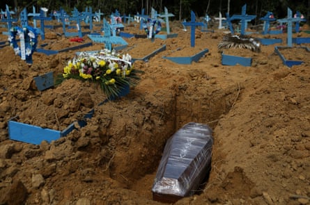 The Parque Taruma cemetery in Manaus. There have been unfounded claims that coffins were being filled with rocks to inflate Brazil’s Covid-19 death toll. Photograph: Bruno Kelly/Reuters