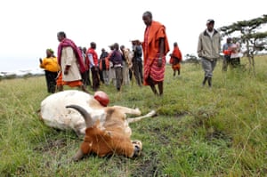 Maasai tribesmen look at a cow killed during an elephant attack on the outskirts of Nairobi. Photograph: Alamy