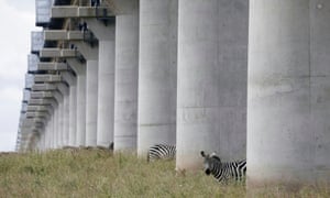 Zebras graze under a bridge of the Mombasa–Nairobi Standard Gauge Railway inside Nairobi national park. Photograph: Baz Ratner/Reuters