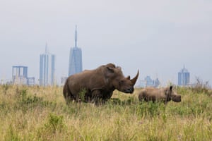 A southern white rhino and her calf in the park, with the city skyline in the background. Photograph: Baz Ratner/Reuters