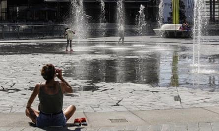 A woman drinks as children cool off in a public fountain in Milan, Italy, on 31 July. 2020 is set to be hottest or second hottest on record, in line with the longer-term trend of rising temperatures. Photograph: Luca Bruno/AP