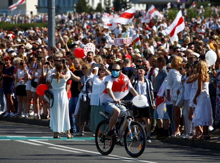 Seven days after the country’s authoritarian ruler, Alexander Lukashenko, claimed to have secured 80% of the vote in a presidential election, his legitimacy is in tatters and his regime faces its biggest crisis since he came to power 26 years ago. The mood at Sunday’s rally was stoked further by egregious police violence against thousands of protesters earlier in the week.