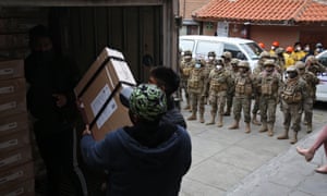 Employees of the electoral court, guarded by the military police, load a truck with electoral material to be distributed for Sunday’s general election, in La Paz, on Firday. Photograph: AFP/Getty Images
