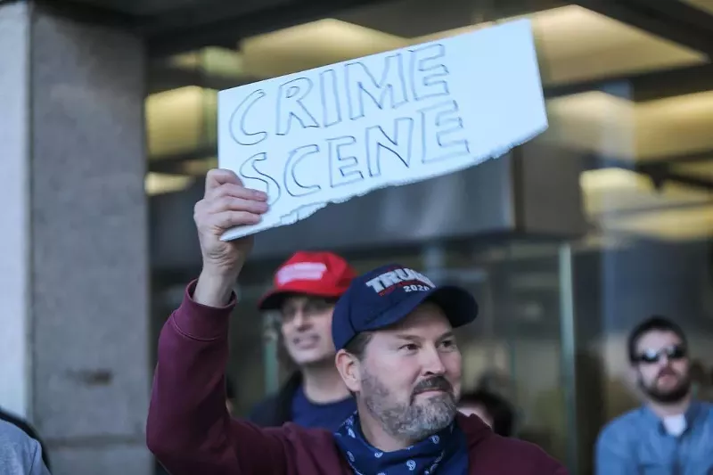 A Trump supporter wielding a sign alleging voter fraud outside of Detroit's TCF Center.