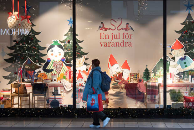 A woman passes a Christmas-decorated shopping window in central Stockholm on Nov. 10.