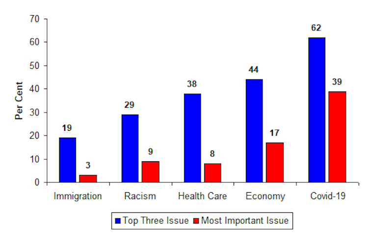 As the first graph, above, shows, 62% of 2,500 respondents cited the COVID crisis as one of the top three issues facing the country, while 39% said it was the single most important. No other issue – not even the ailing economy – was chosen as most important by one person in five.