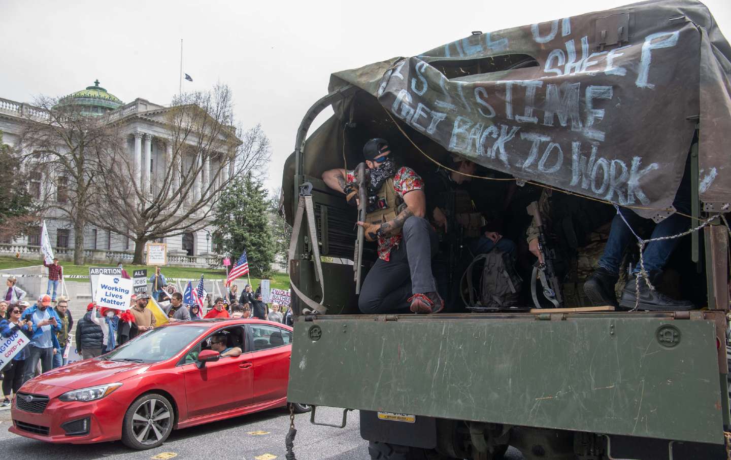 By Elie Mystal APRIL 21, 2020 THE NATION ITS TIME TO GET BACK TO WORK IS PAINTED ON BACK OF TRUCKMen carrying a guns take part in a “reopen Pennsylvania”