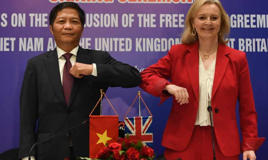 Liz Truss elbow bumps Vietnam’s minister of industry and trade, Tran Tuan Anh, after signing a free trade agreement in Hanoi in December. Photograph: Nhac Nguyen/AFP/Getty Images