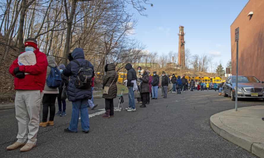 People wait in line to receive a vaccine at a high school in Paterson, New Jersey. The Trump administration did not track vaccines between federal distribution and administration to patients, Biden officials told Politico. Photograph: Ted Shaffrey/AP