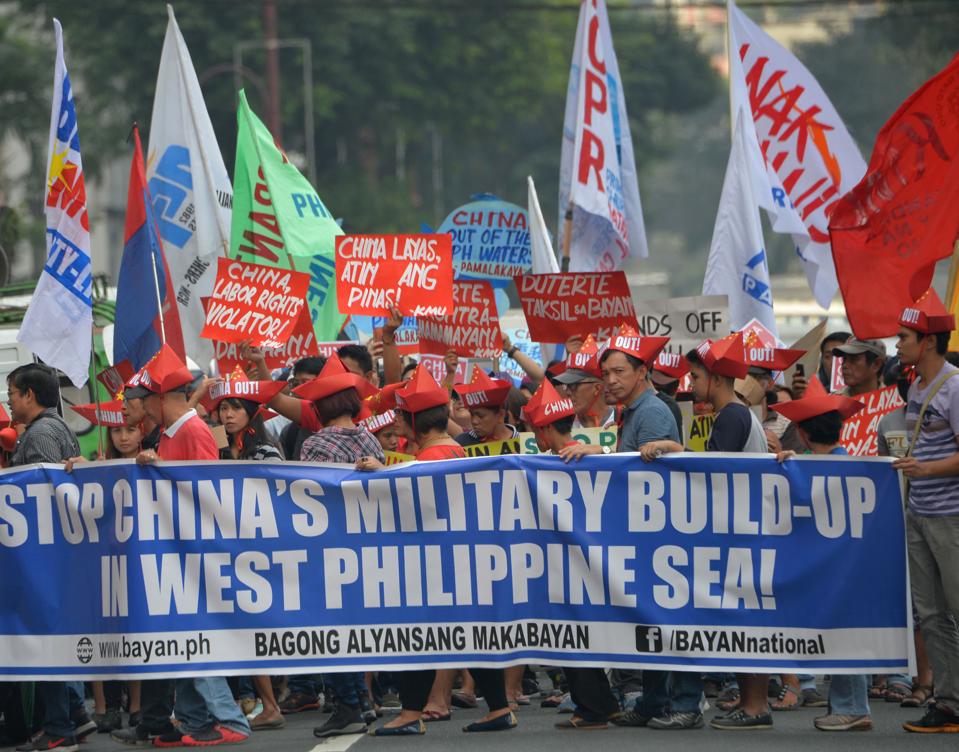 Activists carry placards during a protest in front of the Chinese consulate in Manila on February ... [+] AFP VIA GETTY IMAGES