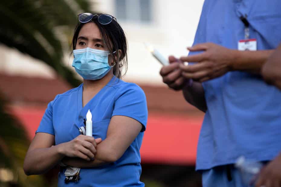 Hospital staff hold a vigil for Celia Marcos, a health worker who died in Los Angeles in May. The absence of reliable federal data exacerbated critical problems such as shortages of PPE that left many workers exposed. Photograph: Étienne Laurent/EPA