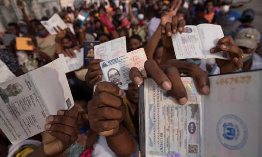 Haitians gather at the US embassy in hopes of visas amid fear and uncertainty following the assassination of the country’s president. Photograph: Orlando Barría/EPA