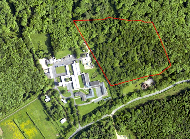 The Monks Wood Wilderness (outlined in red) in 2014, after 53 years of natural regeneration. UK Centre for Ecology & Hydrology, Author provided