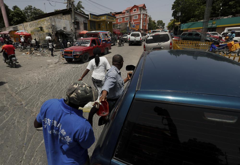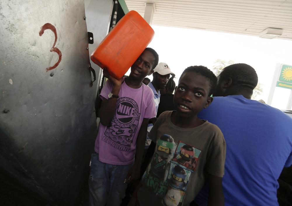 A young man fills a driver's tank with gasafter reselling it to him, in Port-au-Prince, Tuesday, July 13, 2021, almost a week after President Jovenel Moise was assassinated in his home. (AP Photo/Fernando Llano)